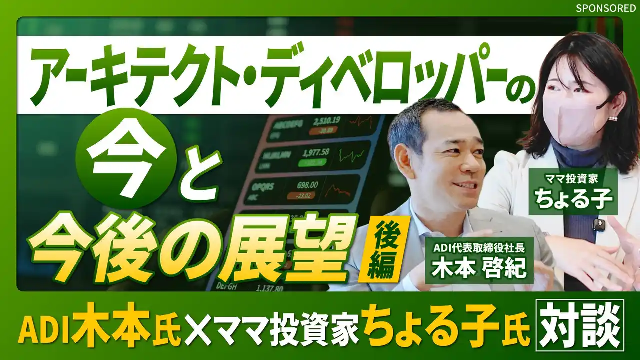 | 株式会社アーキテクト・ディベロッパー(本社:東京都中央区銀座、代表取締役社長:木本 啓紀、以下「ADI」)は、元手240万円を3億円に増やした実績を持つママ投資家・ちょる子氏との特別対談動画・記事を、株式会社幻冬舎ゴールドオンライン公式YouTubeチャンネルにて全4回シリーズ、最終話まで公開しました。 | ||||||||||||||