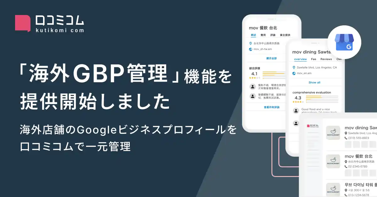 店舗向け集客一元化プラットフォーム「口コミコム」および業界最大級のインバウンド業界メディア「訪日ラボ」を運営する株式会社mov(代表取締役:渡邊 誠、本社:東京都渋谷区、以下mov)は、海外店舗のGoogleビジネスプロフィール(以下、海外GBP)や口コミ分析を「口コミコム」内で管理、実行できる新機能「海外GBP管理」の提供を開始いたしました。 |