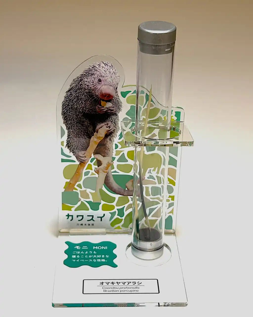 カワスイで展示されている、オマキヤマアラシのモニから抜け落ちた本物の針を標本として飾れるアクリルスタンド。 |