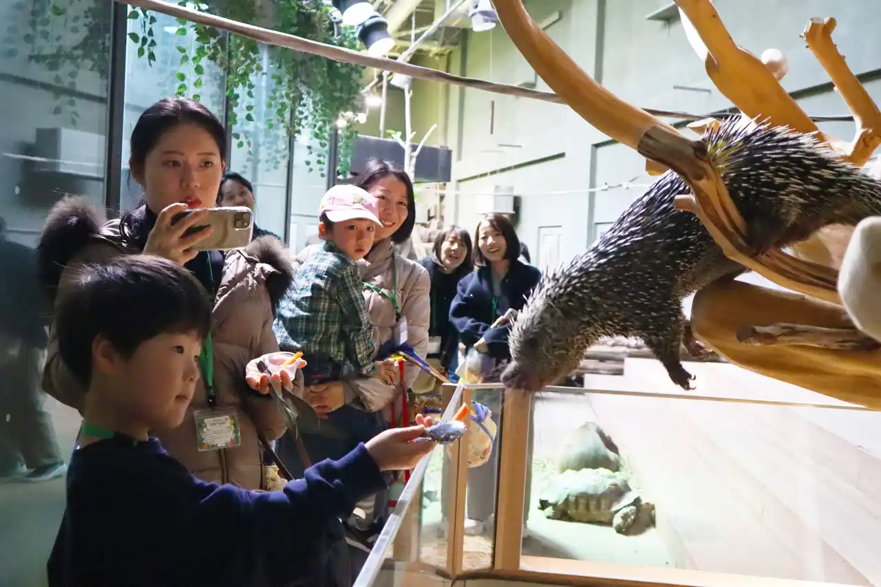 普段はエサやり体験ができないオマキヤマアラシにもエサをあげられます。 |