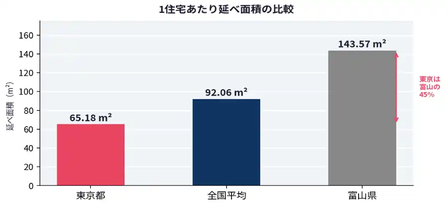 特に都市部では、住宅面積の制約が深刻です。総務省「住宅・土地統計調査」(平成30年)によると、東京都の1住宅あたり延べ面積は65.18m²で、全国平均92.06m²の約71%にとどまります。富山県(143.57m²)と比べると半分以下です。限られた収納スペースに、四季分の衣類を収めなければなりません。 |