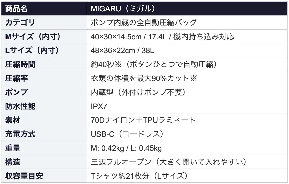 「使わなくなった圧縮バッグ」を「毎日使える収納ツール」へ。旅行と収納の両方を一台でこなすMIGARUは、現在Makuakeにて先行受付中です。 |