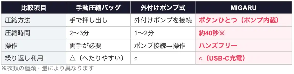 圧縮バッグは旅行の定番アイテムです。しかし、国内主要ECサイト(Amazon・楽天市場)の圧縮バッグカテゴリにおける低評価レビュー計312件を横断分析した結果(合同会社onigiri独自調査、2026年3月実施)、最も多かった不満は「手動圧縮の手間」でした。 |