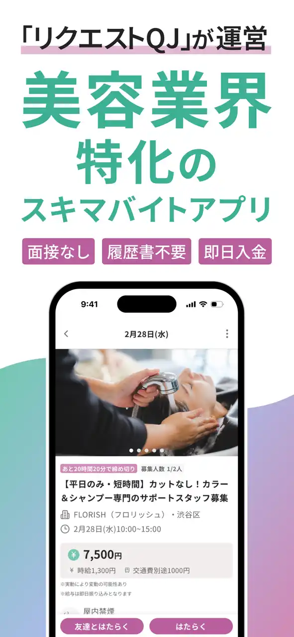 「re-quest/QJ SPOT WORK」は、即戦力の美容師と、一時的な人手を必要とするサロンを最短1時間からマッチングするサービスです。 |