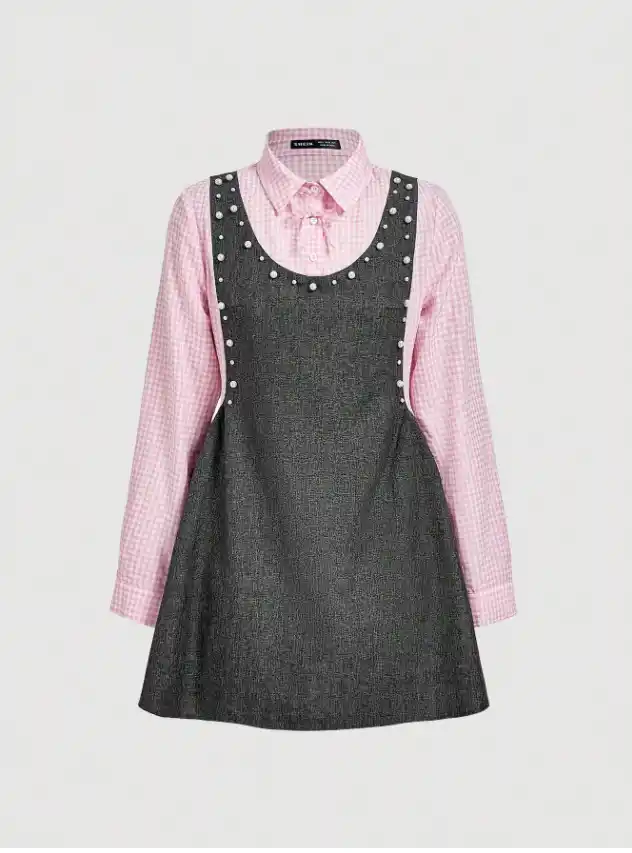 商品名:女性のピンクシャツ&グレータンクドレス、2in1ショートドレス |