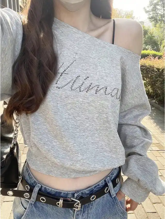 商品名:非対称ネック レタープリント 長袖スウェットシャツ |