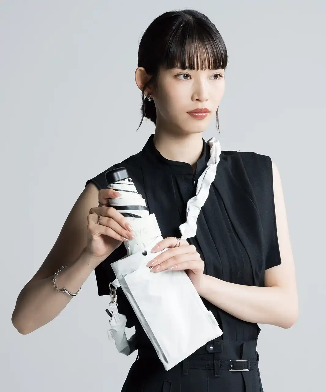 いつでも手軽に紫外線対策が可能な、ショルダーポシェット付きの折りたたみ傘。 |
