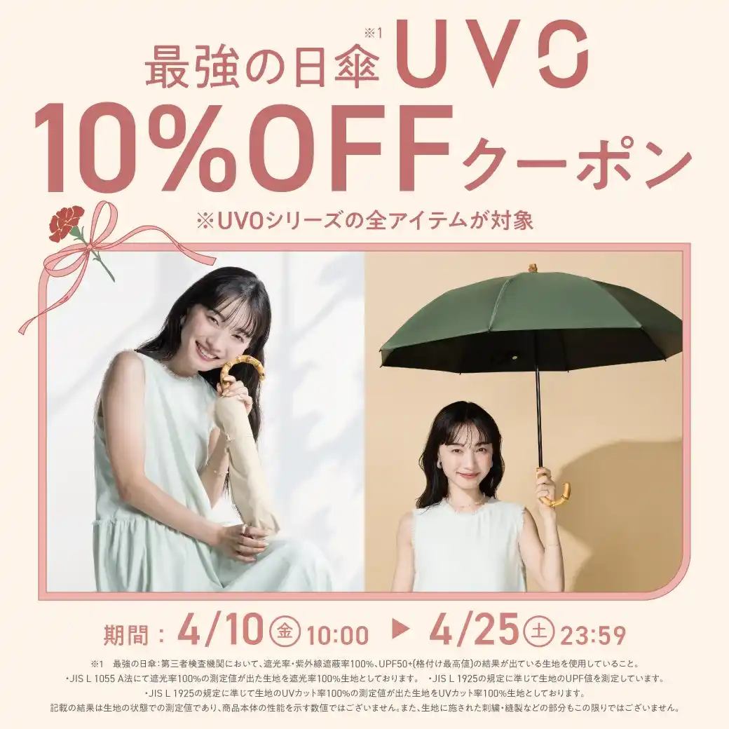 公式オンラインストアでは、母の日特別企画としてUVO全アイテム10%OFFクーポンを配布しております。感謝の気持ちと一緒にUVOを贈ってみてはいかがですか? |