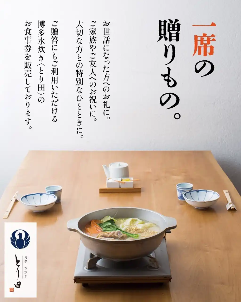 | 株式会社studio092(本社:福岡県福岡市、代表取締役 奥津啓克)が運営する「博多水炊き とり田」は、このたび「一席の贈りもの」をコンセプトとしたお食事券の販売を開始いたしました。 |
