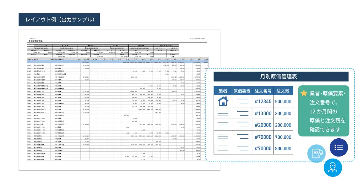一つの帳票で最大12か月分の注文単位かつ「原価要素ごと」の発生原価と注文残を確認することができます。原価要素別・注文別の推移を一つの帳票で把握できるため、コスト管理の精度向上に役立ちます。 |