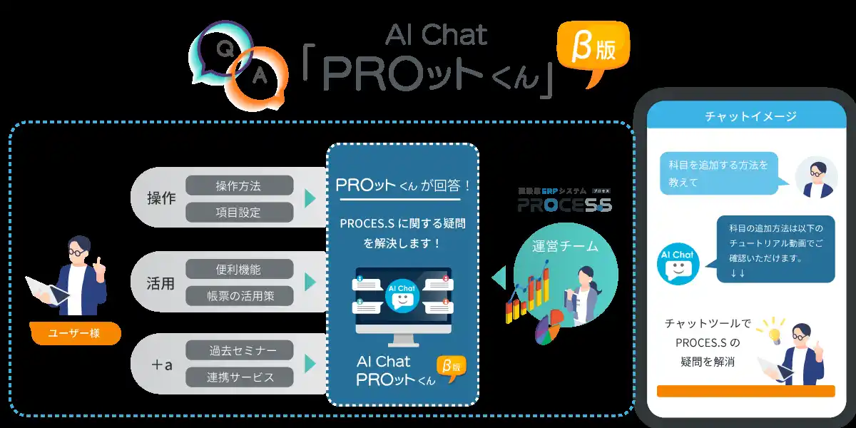 PROCES.Sサポートサイトでは、新たにAI Chat「PROットくん」の提供を開始しました。「PROットくん」は、内田洋行ITソリューションが事前にご用意したナレッジを参照し、お客様へ回答を行います。PROCES.Sに関する疑問やお客様が知りたい内容について、FAQやチュートリアル動画から探すことなくチャット形式でご確認いただけます。 |