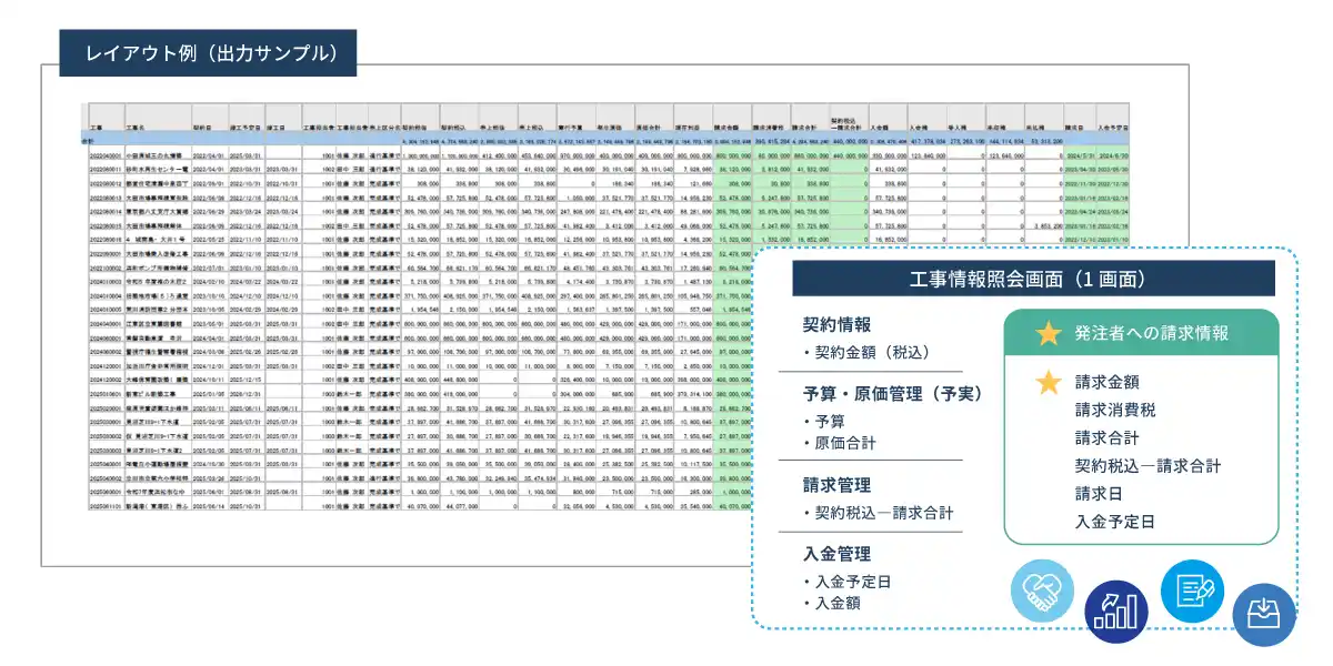 原価管理帳票(協力業者からの仕入)に施主への請求、入金の情報が追加されることによって、これまで別々の帳票で見比べていた情報を一つの帳票で把握することができるようになります。通常、原価管理帳票は「原価管理のための帳票」であり、原価(協力会社からの仕入)の情報のみを様々な切り口で網羅しているものです。本機能では請求・入金と仕入情報をまとめて確認ができ、情報照会に活用できます。 |