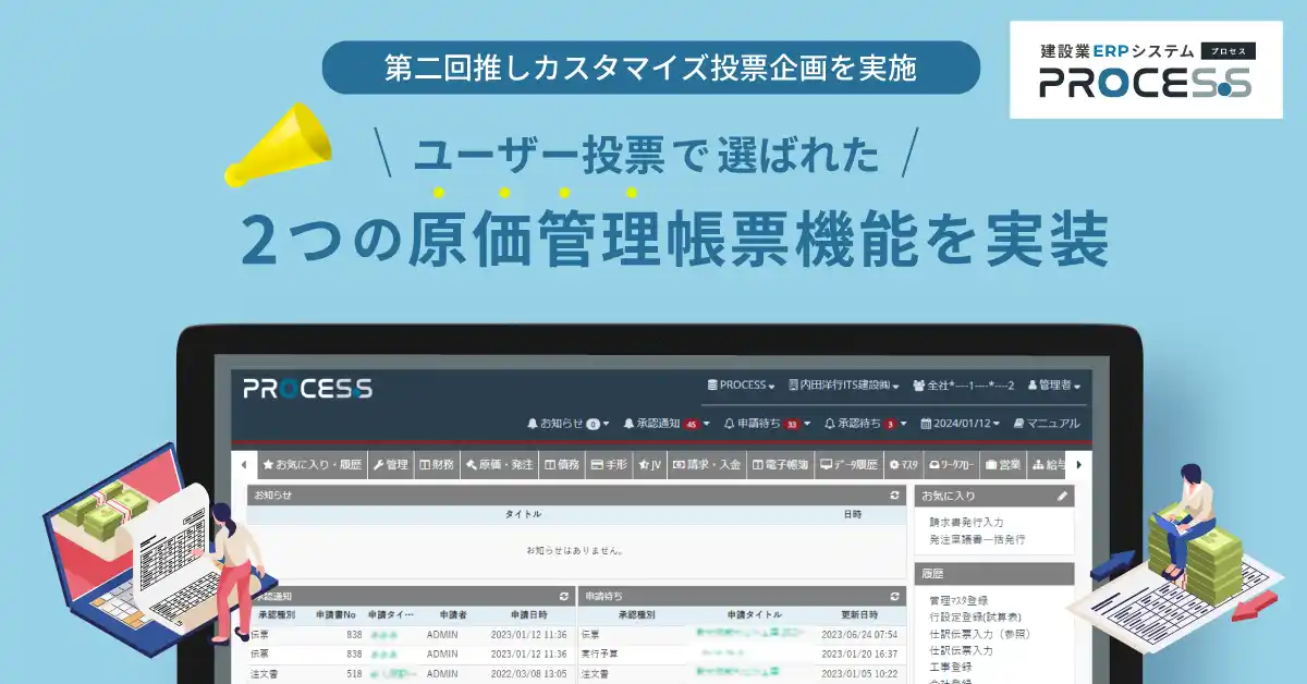 建設業ERPシステムPROCES.S(プロセス)は、「お客様の声を大切にし、共に成長する製品」をコンセプトに、お客様の日々の実務から生まれるアイデアを製品へ反映する取り組みを行っています。その一環として、PROCES.Sサイトで、ユーザー参加型の「推しカスタマイズ投票」企画を実施し、システムを利用されるお客様から改善アイデアとご意見を募り、支持の高い機能を実装しています。 |