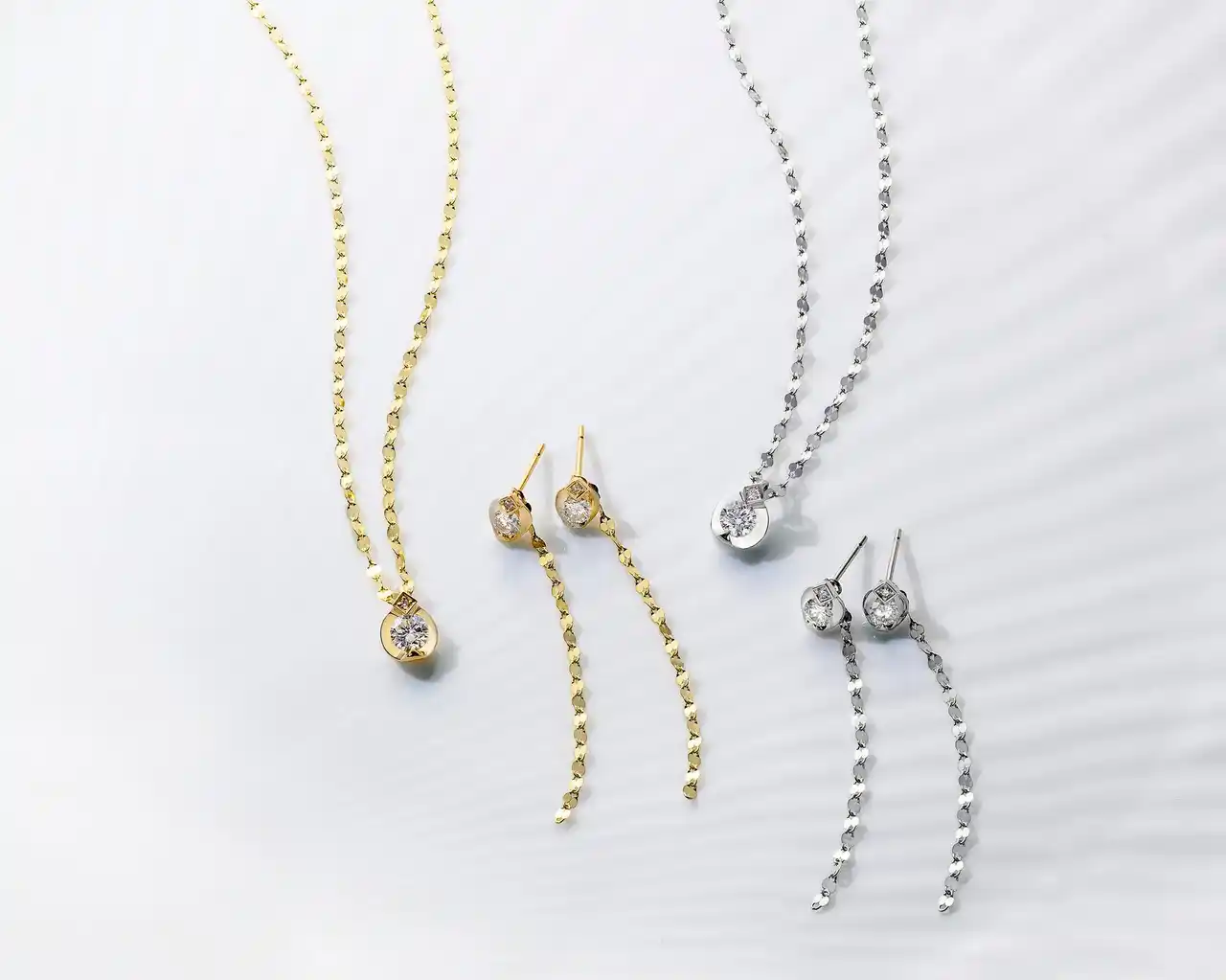 花びらを連ねたようなデザインのペタルチェーンは、動くたびに光を反射し、華やかな輝きを演出します。 |