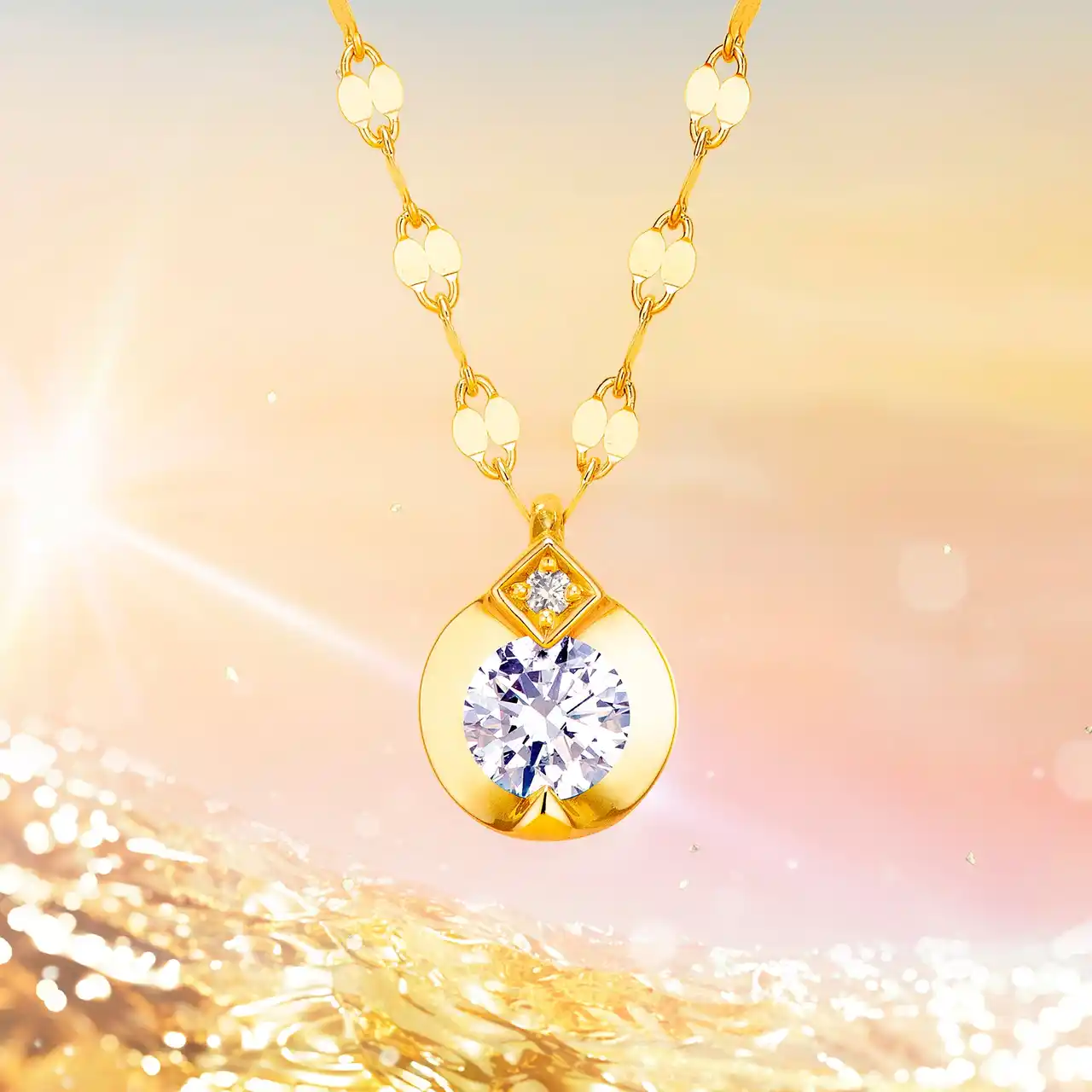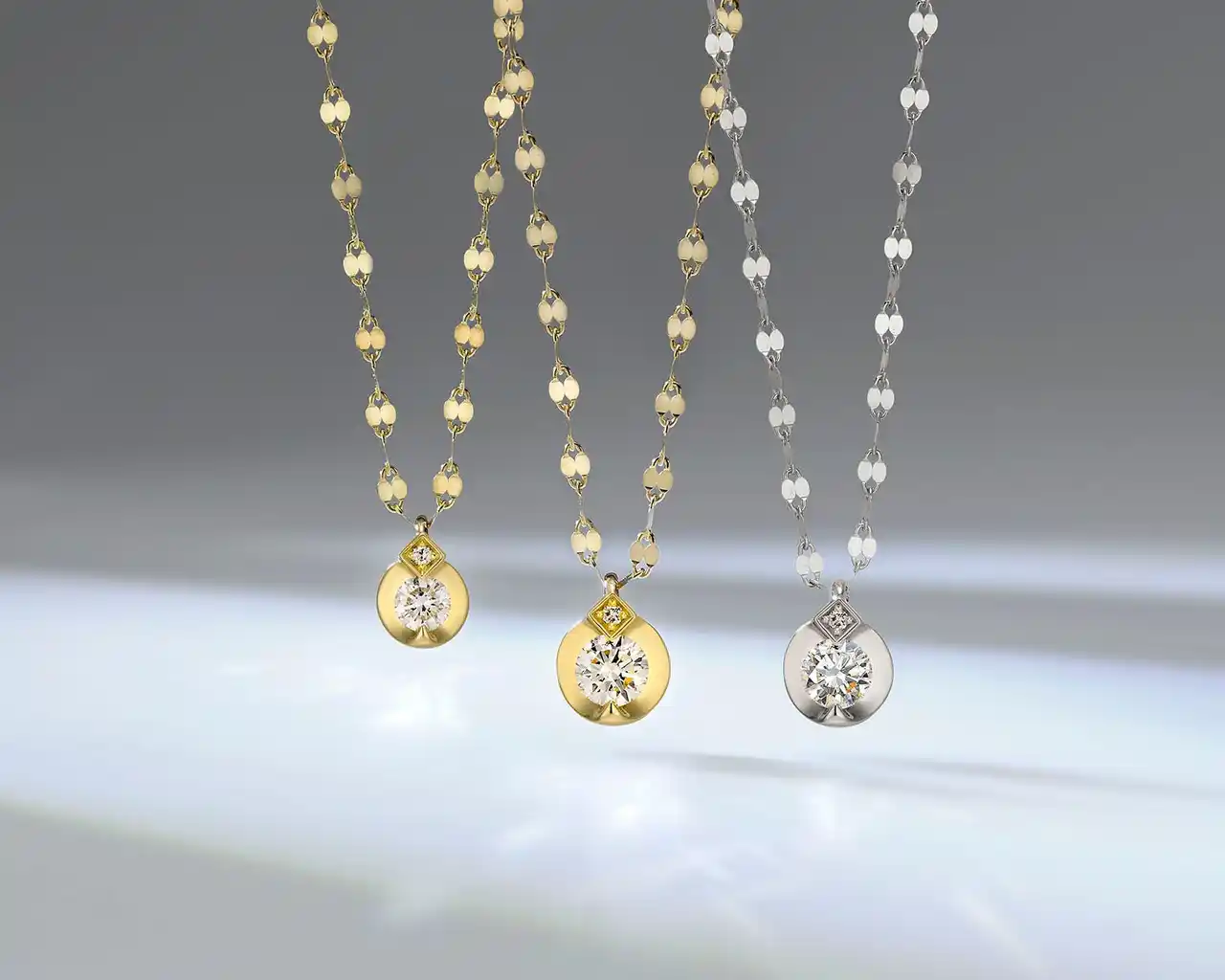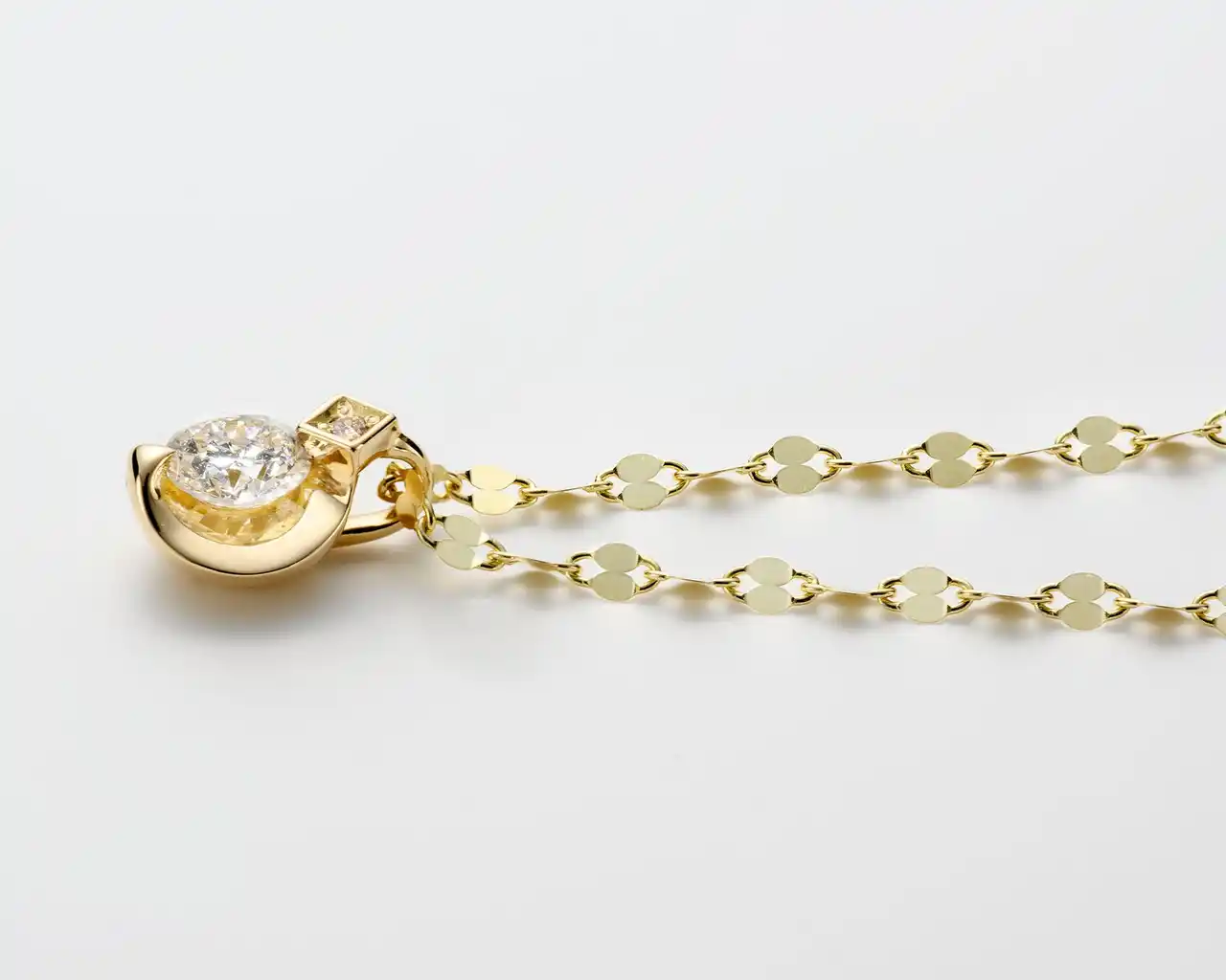 上下2点留めのセッティングにより、ダイヤモンドが宙に浮かぶような透明感を実現。 あらゆる角度から光を取り込み、美しい輝きを放ちます。ヘッド部分はチェーンから取り外しも可能。 |