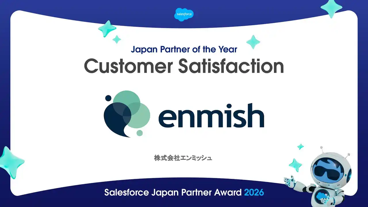 株式会社エンミッシュは、Salesforce Japan Partner Award 2026におけるJapan Partner of the Year - Customer Satisfactionを受賞しました。 |
