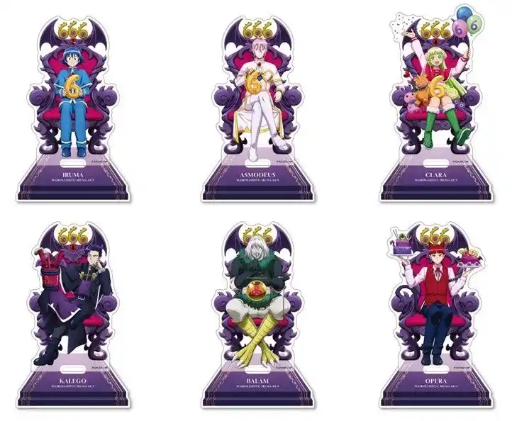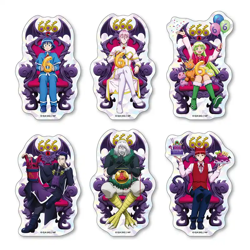 | 今回新たに描き下ろしたイラストを使用した「TOPPA!!! BASE AKIBA」オリジナルのアクリルスタンドです。アニメ放送6周年を記念する「6」をモチーフにしたアイテムとともに、作品内に登場するキャラクター「鈴木入間」「アスモデウス・アリス」「ウァラク・クララ」「ナベリウス・カルエゴ」「バラム・シチロウ」「オペラ」を描いたデザインです。 | |||
