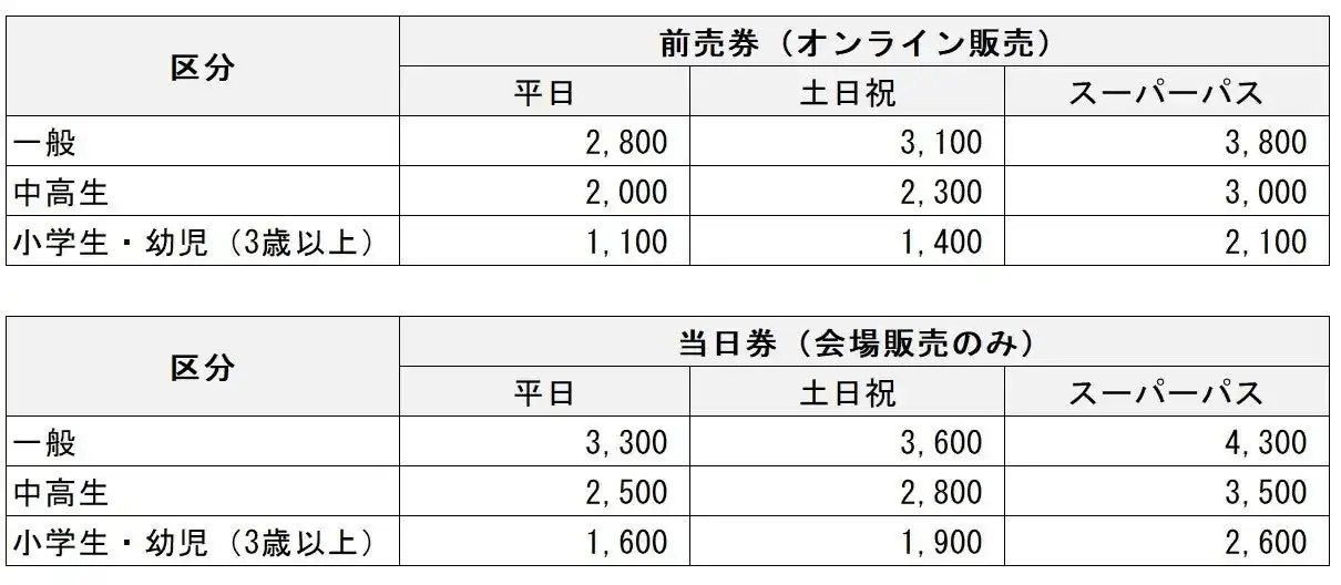 ※ 平日は日付指定、土日祝は日時指定 / ※ スーパーパス : 日時指定なし、優先入場 |