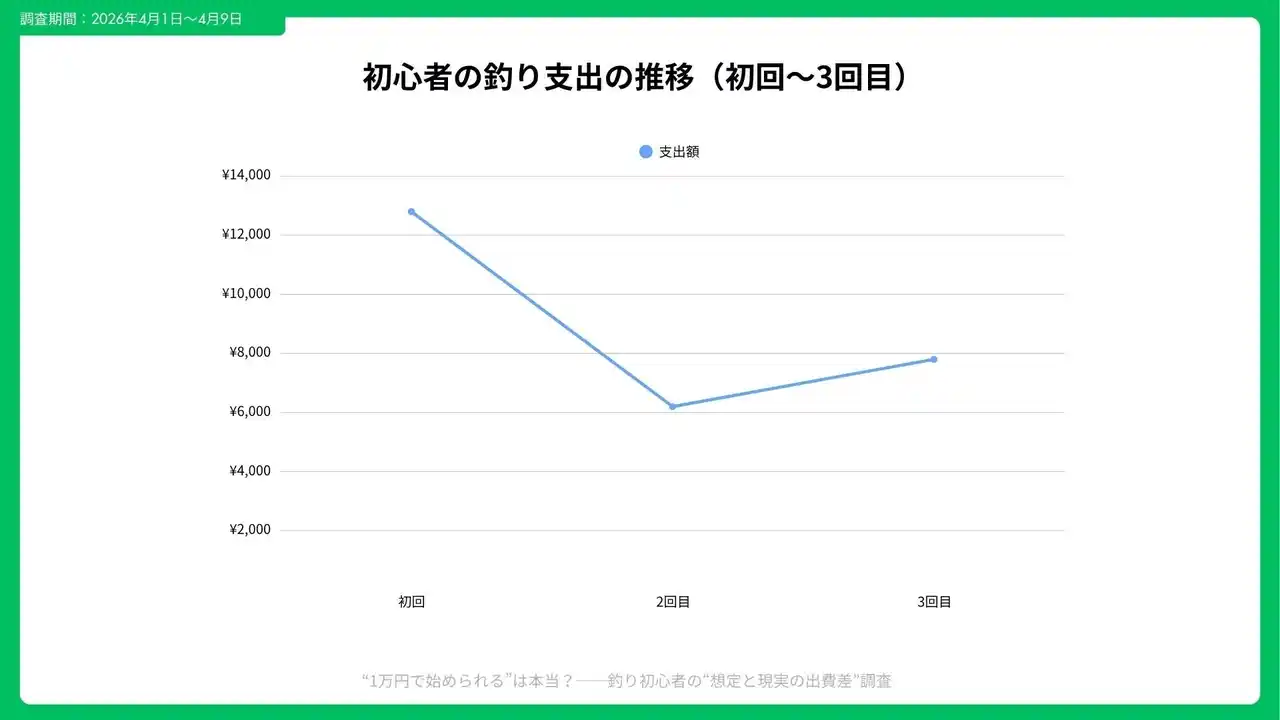 「1万円で始められる」という情報は、最低限の道具価格としては間違いではない。しかし実際には、初回~3回目までで平均¥26,800の支出が発生しており、想定との差は小さくない。特に、消耗品、ロスト、交通費、釣り場料金など、道具以外の出費が初心者の予算を押し上げていた。 |