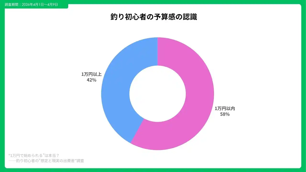 釣りを始める前に想定していた初期費用について調査したところ、「1万円以内で始められると思っていた」と回答した人は 58% にのぼった。平均想定額は¥11,200、中央値は¥10,000となり、“1万円前後で始められる”という認識が主流であることが分かる。 |