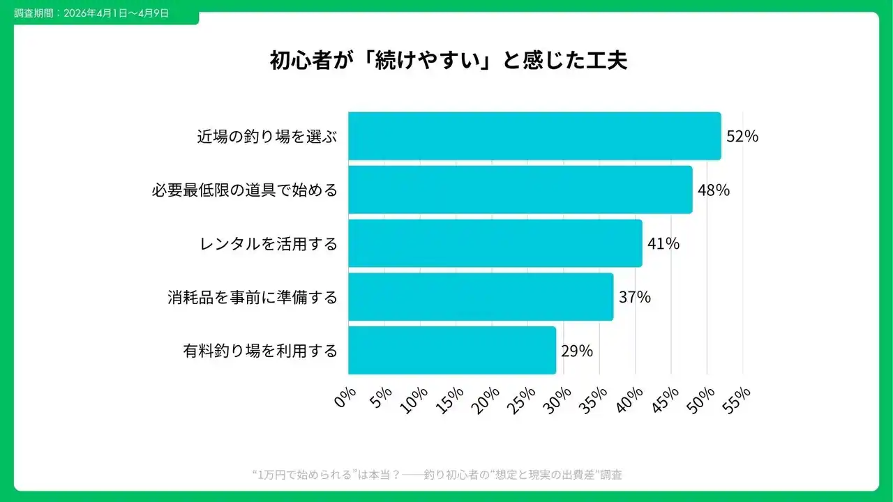 さらに今回の調査では、初回から高額な道具をそろえるよりも、「必要なものだけで始める」ほうが満足度と継続意向の両方につながりやすいことが分かった。釣果が出なくても納得しやすい費用感に抑えることが、続けやすさに直結している。 |