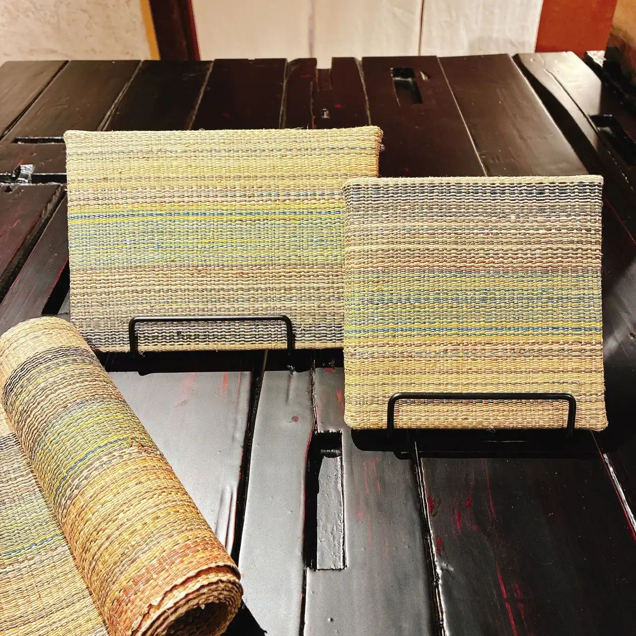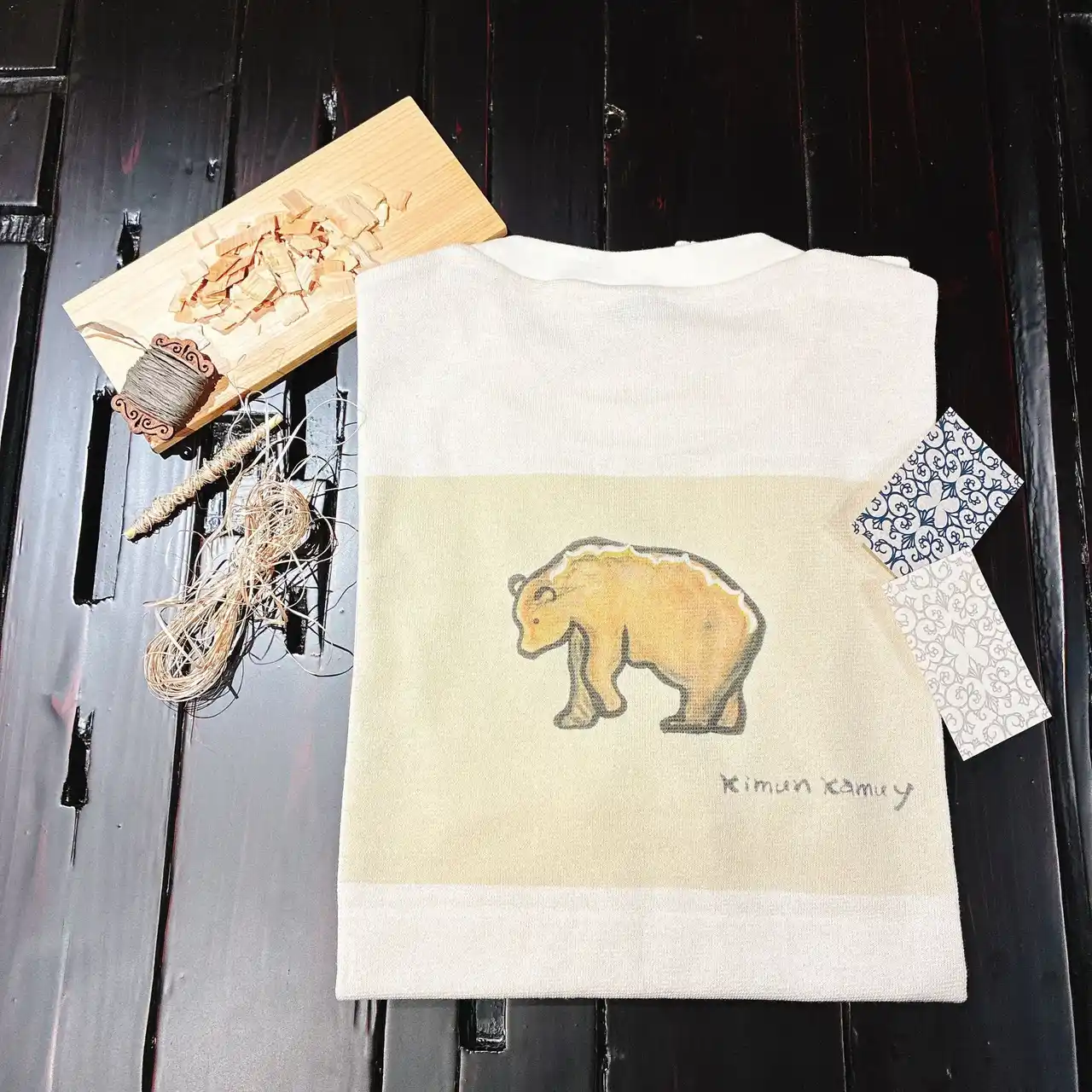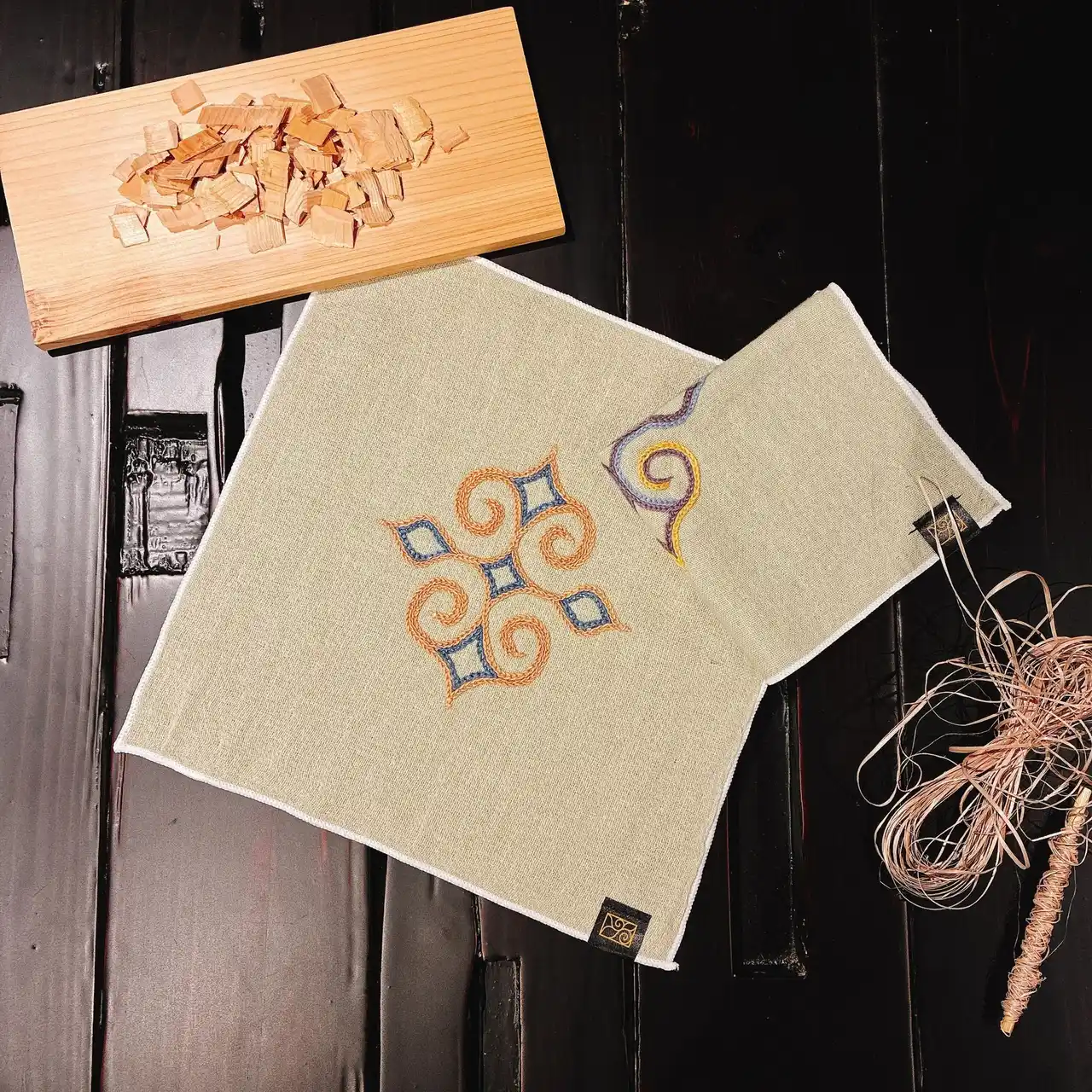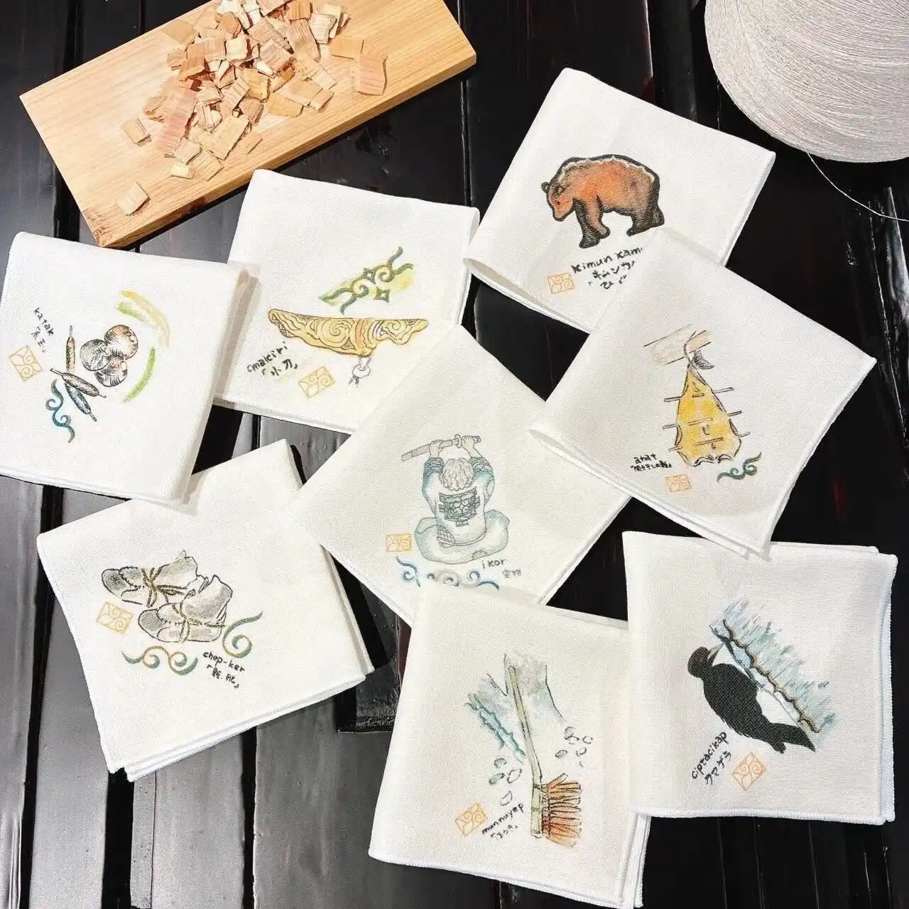 こうしたアイヌの手仕事に共感したのが、一般社団法人アップサイクルが推進する使用後の紙資源や間伐材を紙糸にアップサイクルプロジェクト「TSUMUGI」です。資源を無駄にせず、再利用しながらも価値を高めていくことをテーマにコラボレーション製品を開発しました。タテ糸にアットゥㇱ、ヨコ糸にTSUMUGI の紙糸を用いて伝統的なアットゥㇱ織の技法で織りあげた名古屋八寸帯やコースター・ファブリックパネルをはじめ、アイヌで魔除けといわれるヨモギで染めたTSUMUGI の生地にアイヌ刺繍をあしらったハンカチ、またアイヌ工芸作家・関根真紀描き下ろしのアイヌ紋様と民具イラストを配したT シャツやハンカチなど、現代のアップサイクル技術とアイヌの伝統技法が織りなすものづくりが生まれました。 |