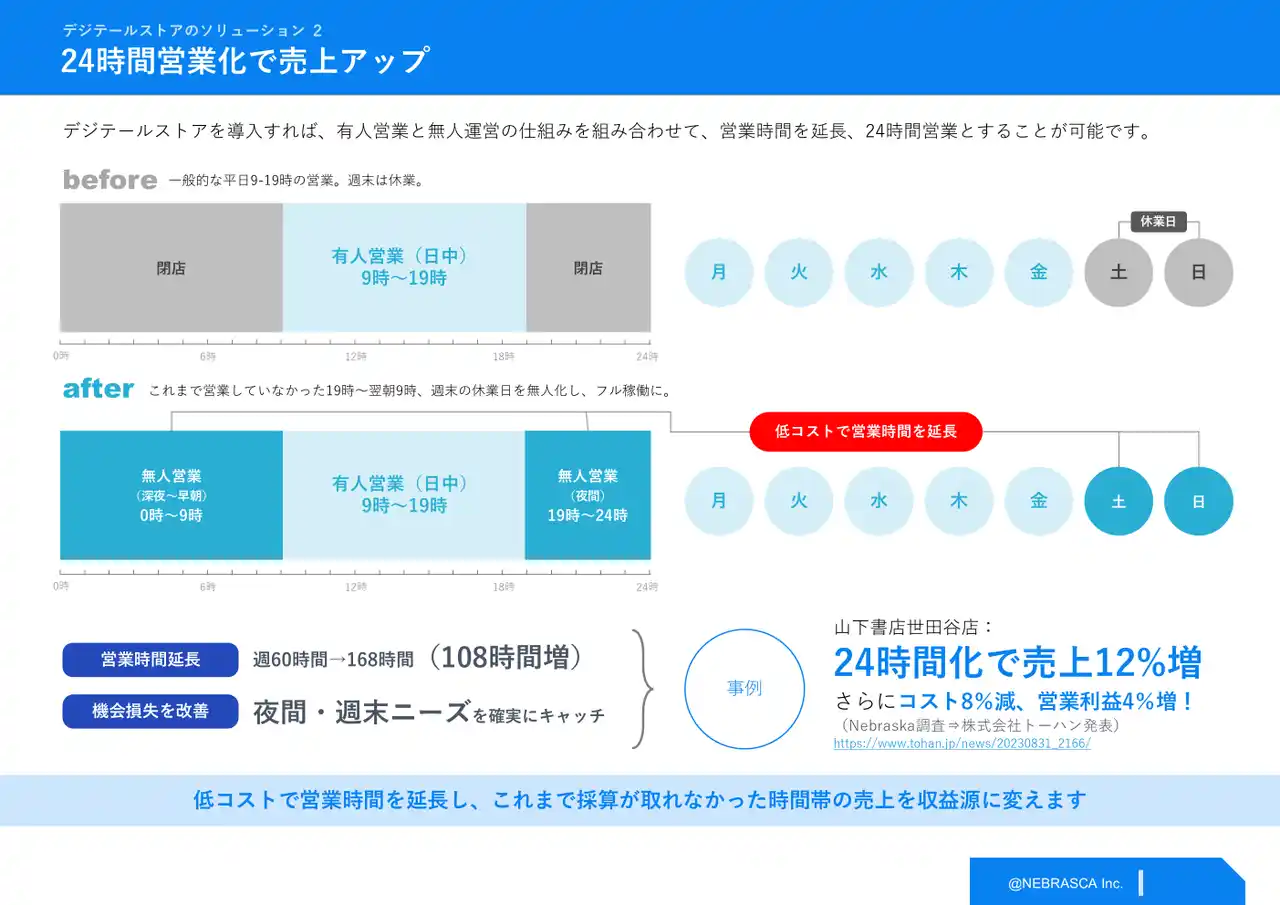 こうした成果は、特定の1店舗・1業態に限られたものではありません。Nebraskaの導入実績では、書店に加え、食品スーパー、文具、古着など複数業態においても、無人化による売上機会の拡大、営業時間延長による収益創出、オペレーション効率化によるコスト最適化といった同様の傾向が確認されています。 |