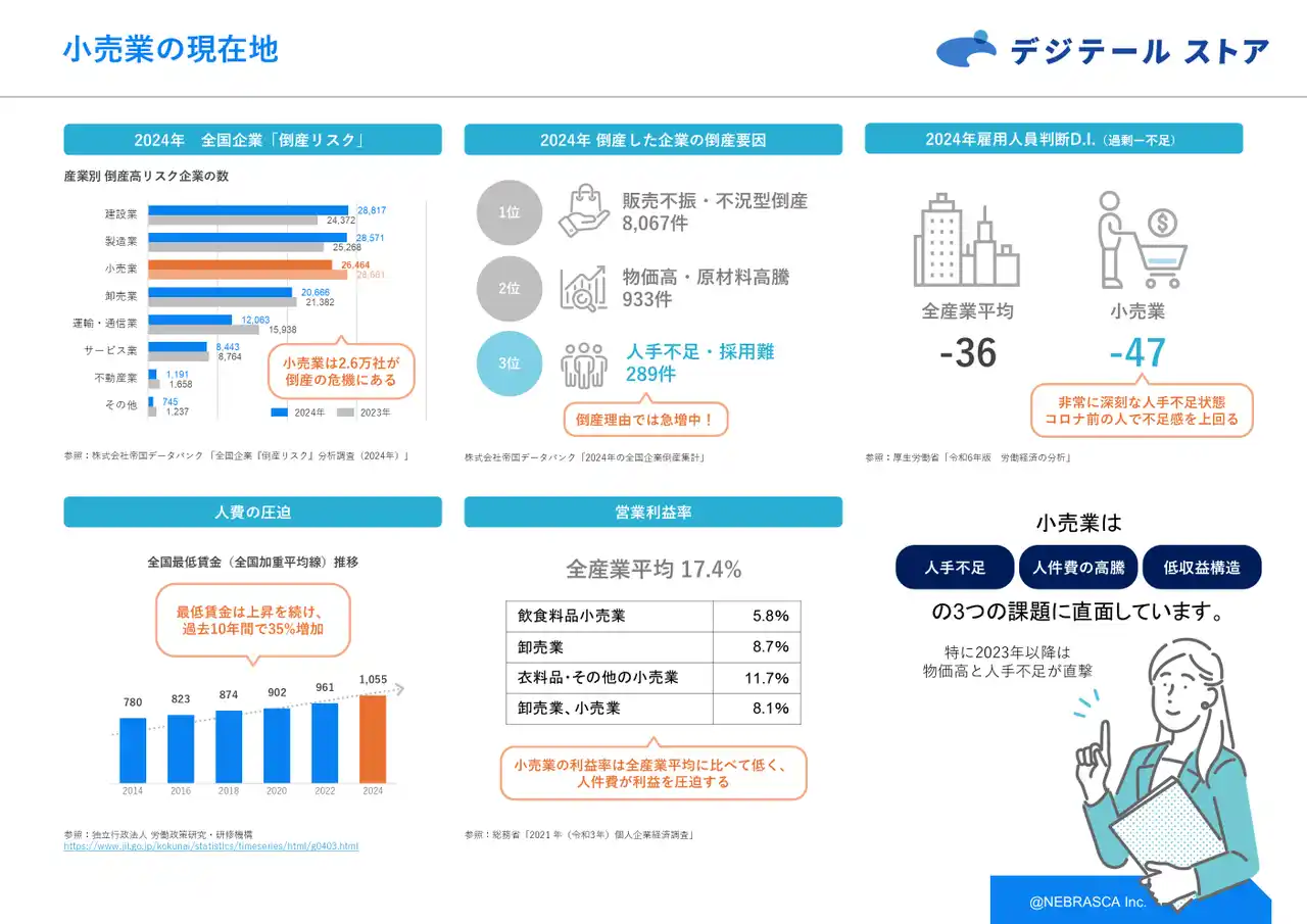 日本の小売業界では、慢性的な人手不足や賃金上昇を背景に、店舗運営コストの増加が大きな経営課題となっています。特に地方や夜間帯では人材確保が難しく、営業時間の短縮や店舗閉鎖につながるケースも増えており、省人化・無人化のニーズは一層高まっています。 |