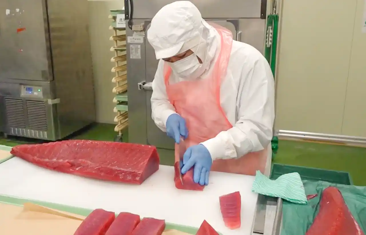 天然の“生”のまぐろは、沖縄県で水揚げされたものの中から、現地の「坂下水産」がプロの目利きにより鮮度の良い個体を買い付けており、どの期間に誰がどこで漁獲したかが明らかに。さらに、本来であればまぐろは仕入れて解体するまで個体の良し悪しがわからないところ、同社の自社加工場で現地加工。職人の熟練の技により、まぐろに包丁を入れる際に鮮度や品質のクオリティを見極め、口当たりが良く濃厚な旨みを感じられる部分だけを残しながら「柵」や「ぶつ切り」といった状態までの加工を現地で施しています。