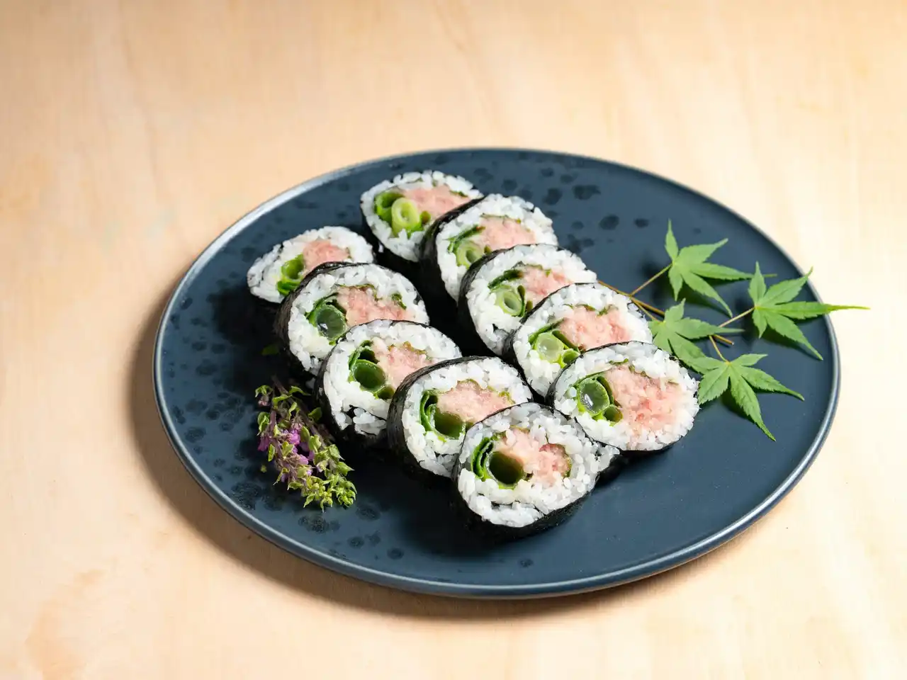 一度も冷凍していないまぐろたたきを使用した巻き寿司です。まぐろのもっちりした粘りと、葱のアクセントをお楽しみいただけます。 |