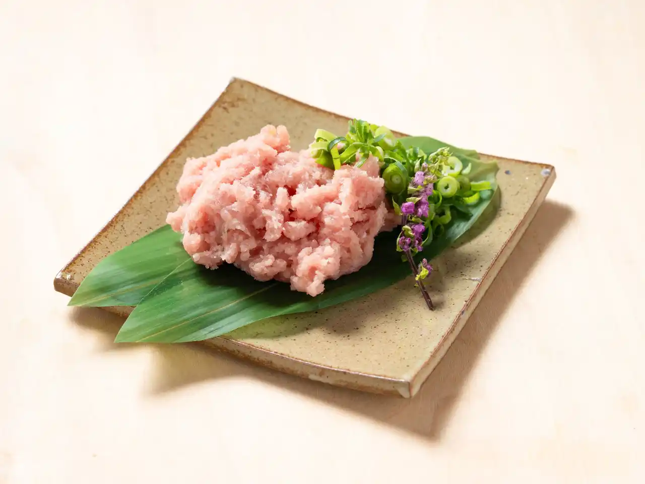 一度も冷凍していない“生”まぐろを使用したまぐろたたき。水っぽさや生臭さがほとんどなく、まぐろ本来の風味や旨みをお楽しみいただけます。お客様のお好みに応じたアレンジでお楽しみください。 |
