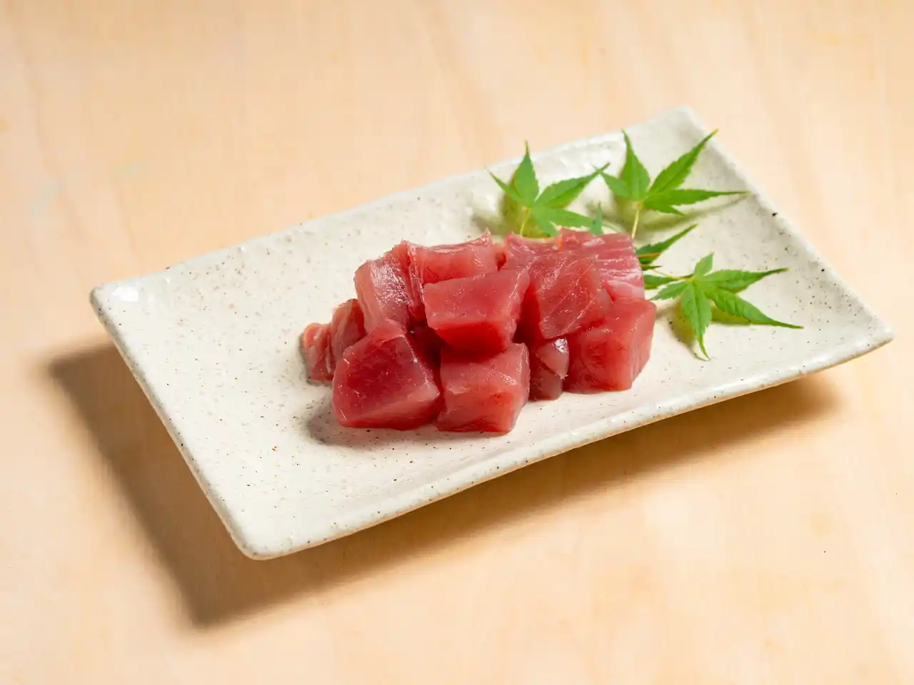 沖縄では、“生”のまぐろのブツ切りが親しまれています。ブツ切にカットすることで生まぐろのもちもちとした食感をより楽しんでいただけます。 |