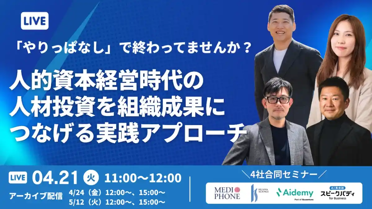 医療機関向け遠隔医療通訳や企業の健康経営(R)支援を行うメディフォン株式会社(東京都港区、代表取締役CEO:澤田真弓、以下「メディフォン」)は、株式会社スピークバディ(以下「スピークバディ」)主催のもと、2026年4月21日(火)に開催される、人的資本経営時代の人材投資を組織成果につなげる実践アプローチをテーマとした合同ウェビナーに登壇いたします。 |