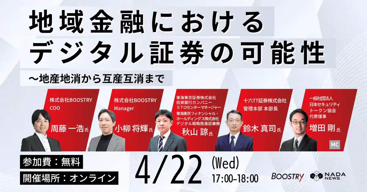 ・イベント名:地域金融におけるデジタル証券の可能性~地産地消から互産互消まで ・日時:2026年4月22日(水)17:00~18:00 ・形式:オンライン開催 ・参加費:無料 ・主催:N.Avenue株式会社(NADA NEWS) ・協賛:株式会社BOOSTRY |