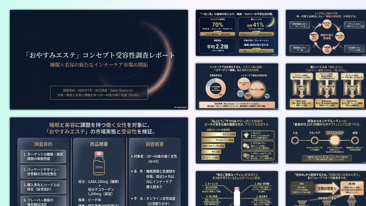 株式会社pow(本社:東京都渋谷区、代表取締役:柳澤 蓮)は、生成AIを活用した市場/ユーザーリサーチエージェント「Spark Research(スパークリサーチ)」(URL:https://sparkresearch.jp/)にて93名の対象者に実施した調査のサンプルレポートを公開したことをお知らせいたします。今回公開した「睡眠×美容ナイトドリンクの受容性調査」についてのレポートは、サービスページよりどなたでもご覧いただけます。 |