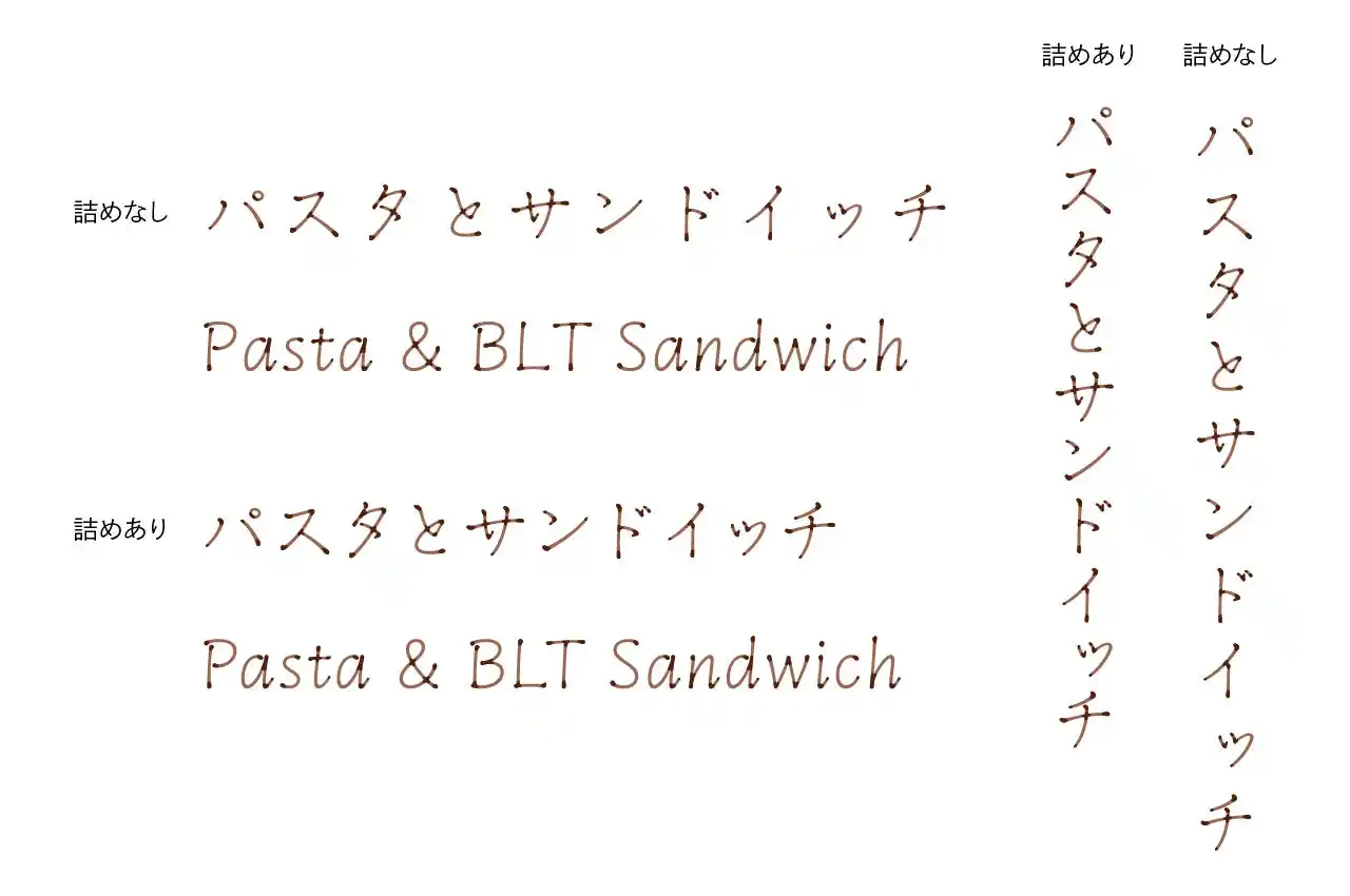 欧文はもちろん、すべての仮名と一部の漢字にメトリクス(詰め情報)を設定しており、文字を打ち込むだけで自然で美しい文字間を再現できます(和文は縦組みにも対応)。 |