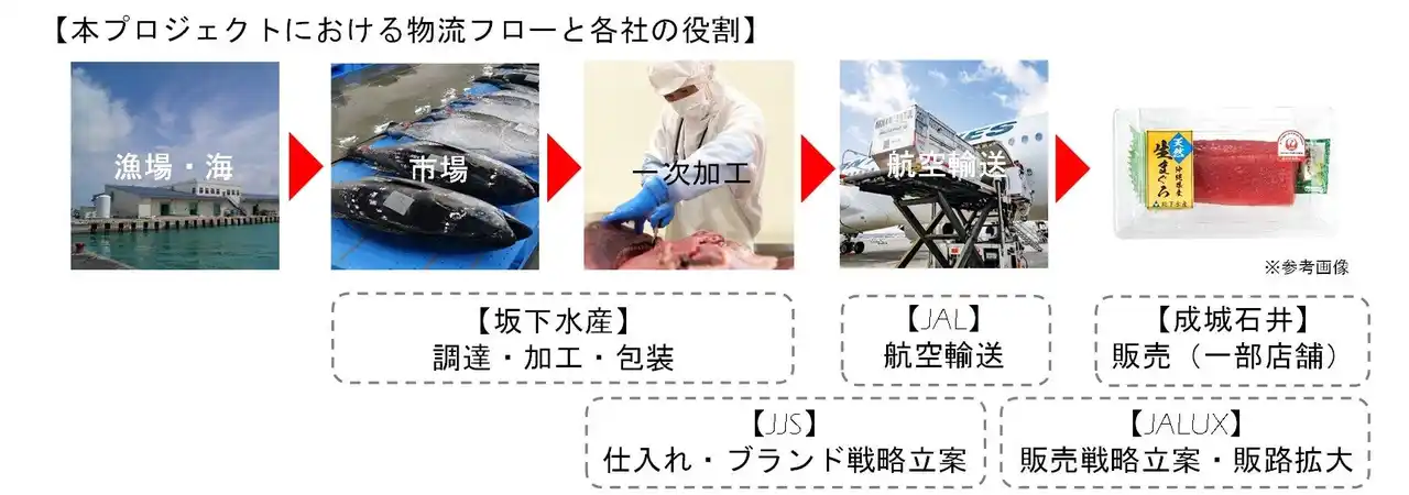 本プロジェクトは、沖縄県産「生まぐろ」のおいしさをぜひお客さまに味わっていただきたいという成城石井の想いと、坂下水産株式会社(沖縄県糸満市)の熟練した目利きによる厳選されたまぐろの仕入れ力および高度な加工技術力、そして氷を使わずに鮮度を保つ保冷機能付きコンテナによるJALグループの航空輸送技術が一体となり実現しました。 |