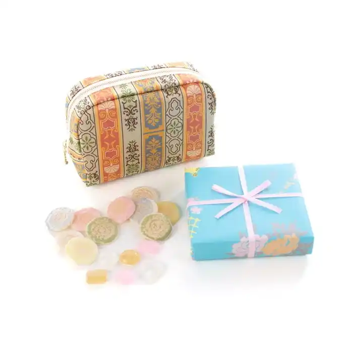 本商品は、龍村美術織物の経錦「ロワール飾花文」を使用したオリジナルBOX型ポーチに、京菓子司 末富のお干菓子の詰め合わせをお入れした特別仕様のセットです。新年度のご挨拶や母の日の贈り物など、大切な方へのギフトとしておすすめの一品となっております。 |