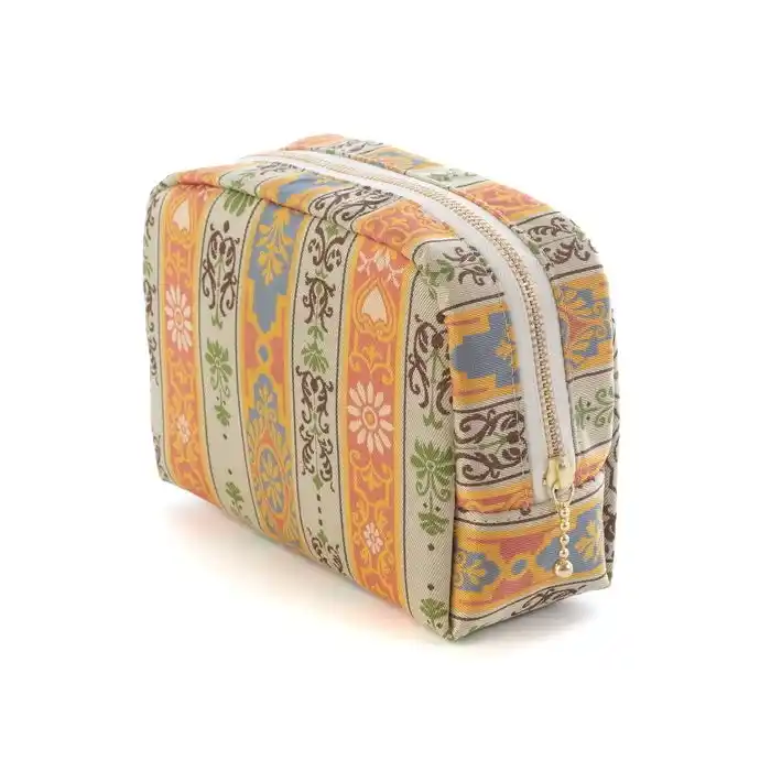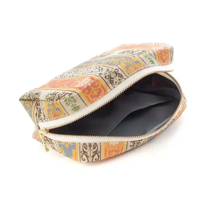 お干菓子を召し上がっていただいたあとも、使って頂きやすいポーチをセットに致しました。 表生地には、優美な意匠や華やかな印象が女性に人気な「ロワール飾花文」をあしらい、格式と華やぎを兼ね備えたBOX型ポーチに仕立てました。YKK製のファスナーを採用し、裏地には汚れを拭き取りやすい素材を使用するなど、細部にまでこだわった特製仕様となっております。 「ロワール飾花文」は、フランス・ロワール河畔の城郭装飾に着想を得た文様で、幾何学的な枠の中に左右対称の植物が美しく配されています。その調和のとれた優雅な意匠は、人と人とのご縁や、穏やかな繁栄への願いが込められています。 |