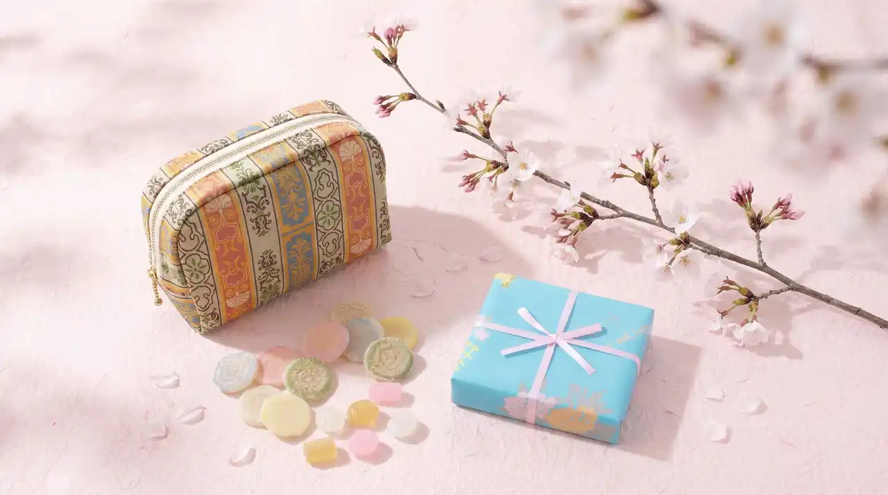 商品名: 京飾花 内容: 龍村美術織物オリジナルBOX型ポーチ+京菓子司 末富製お干菓子のセット 価格: 8,800円(税込) 販売開始日: 2026年4月10日(金) 販売場所: