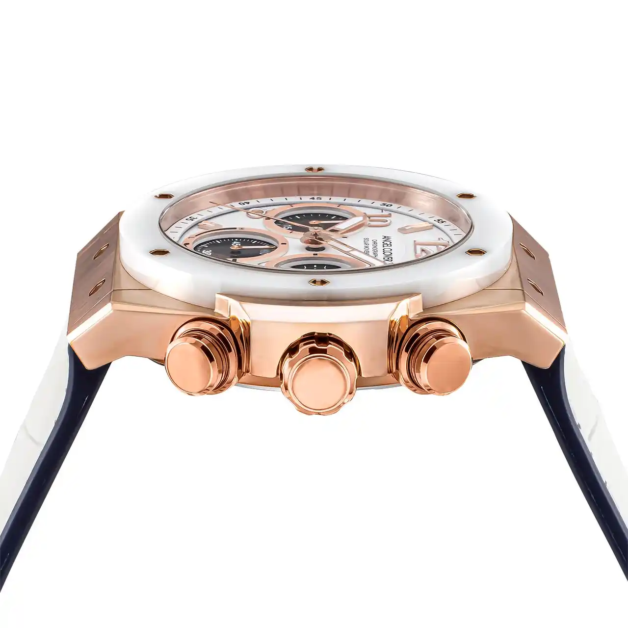 艶やかな光沢を放つセラミックベゼルを採用。スポーティなクロノグラフデザインに上品なアクセントを加え、腕元にラグジュアリーな存在感を演出します。 |
