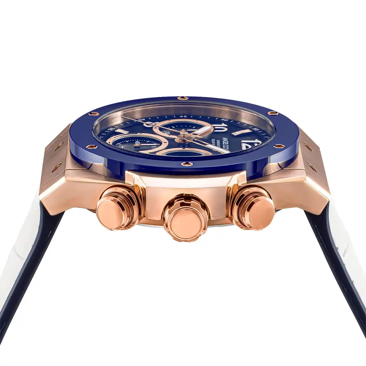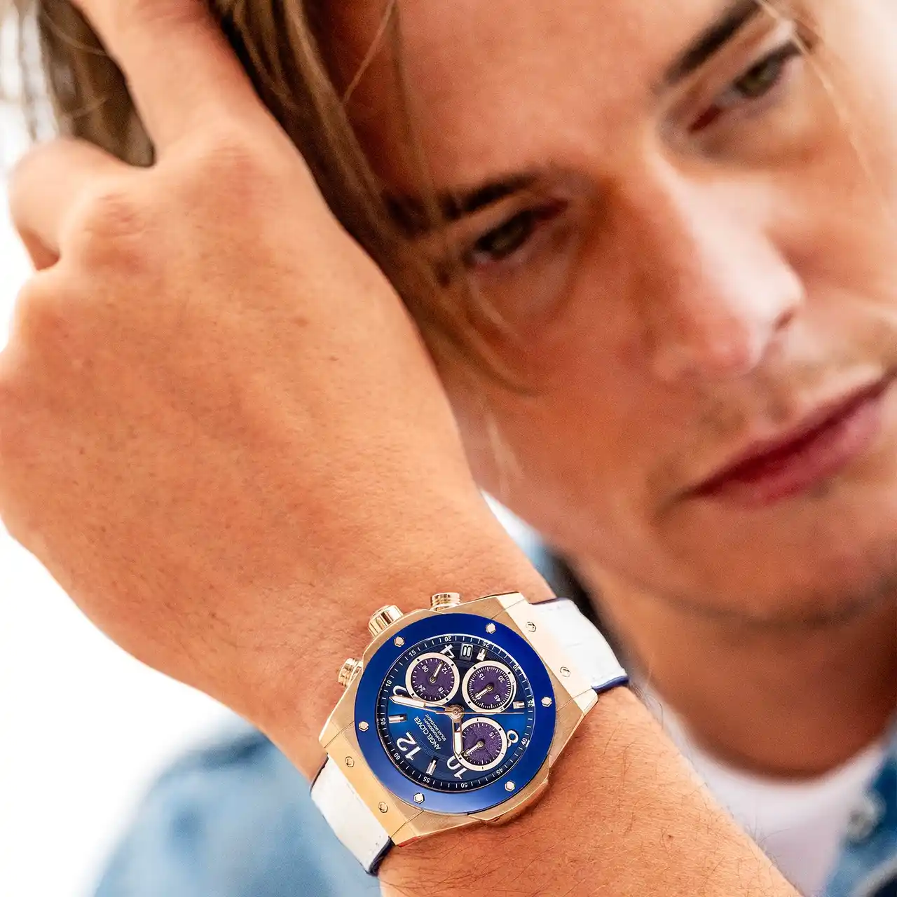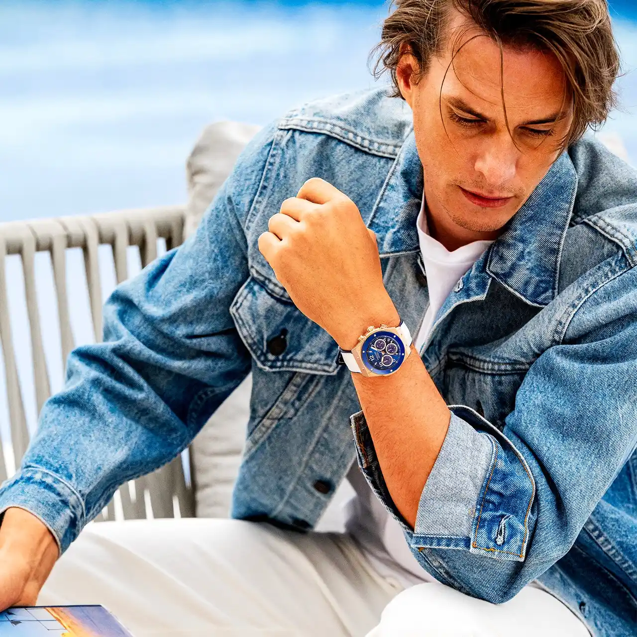 さらにケースにはゴールドカラーを採用。 ブルーやホワイトの爽やかなダイヤルカラーと組み合わさることで、海や空を思わせるリゾートテイストに程よい華やかさをプラスしています。スポーツウォッチのタフさに、ほんのり色気。これが大人の夏時計らしいバランスです。 |
