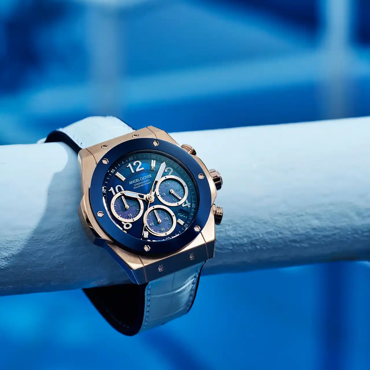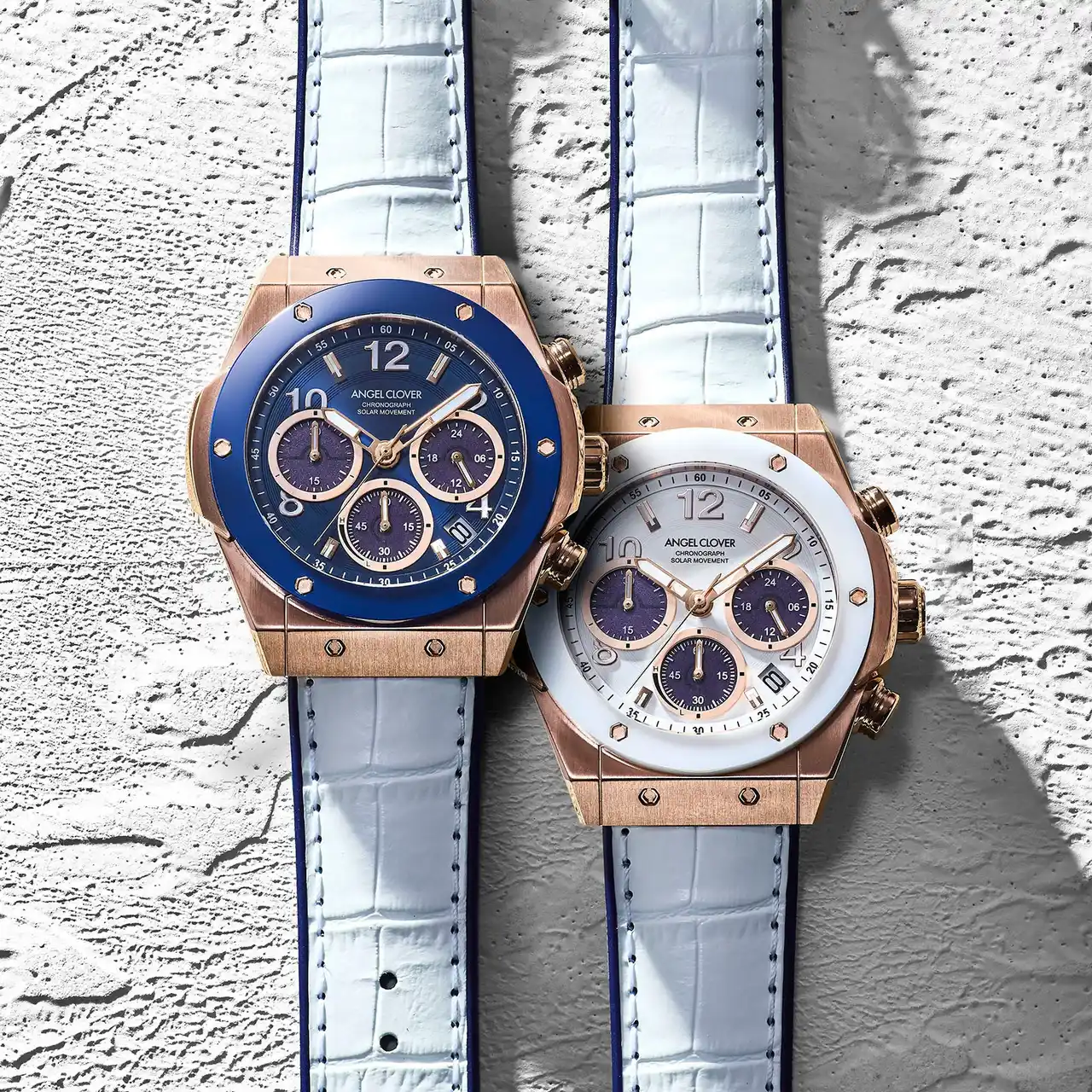 エンジェルクローバーを代表する人気シリーズ『EXVENTURE SOLAR』が、素材と表情をアップデート、『EXVENTURE SOLAR CERAMIC』として新しく登場。艶やかなセラミックベゼルを纏った新作は、スポーティなクロノグラフにほどよい上品さをプラス。空や海を思わせる爽やかなカラーリングが、夏の腕元を軽快に彩ります。 |
