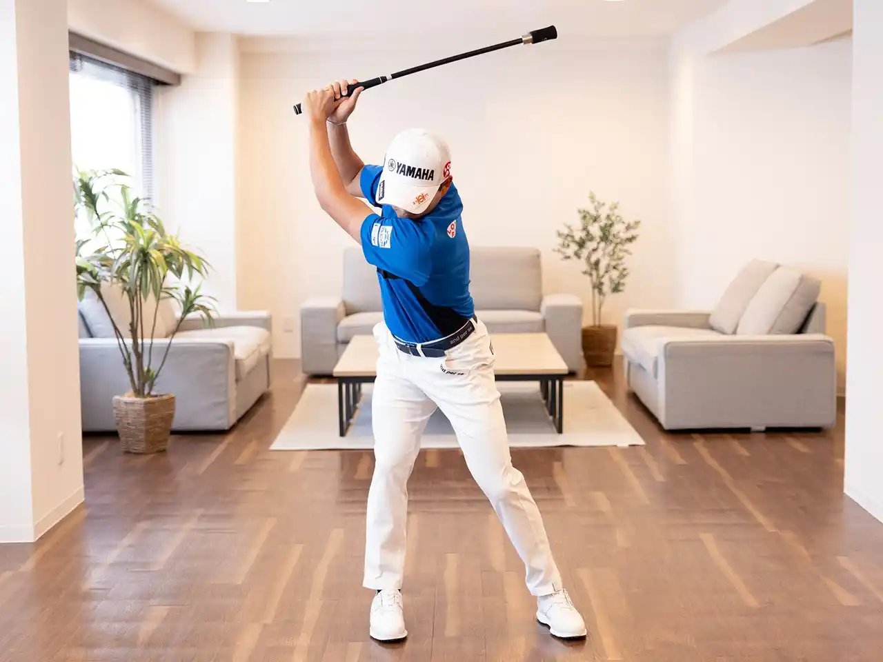 | 室内では全長80cmの練習器具『ダイヤスイングプロツアーショート』を振る姿も収録されています。全長80cmながら約600gの重量があり、しなりや遠心力を強く感じられるモデル。移動先でも気軽に使用できるので短時間でもスイングの“基準”をつくる重要なアイテムとなっています。 | |||
