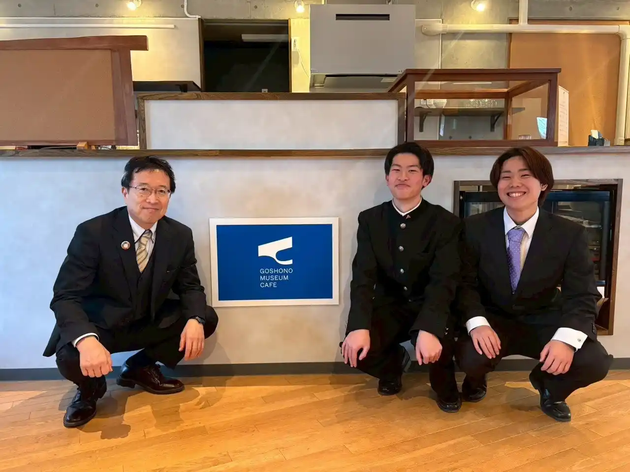 右から2番目:小野寺美登町長、右端:理事長上田、左から2番目:小野太星さん、左端:池田紫月(プロジェクトメンバー県立大3年) |