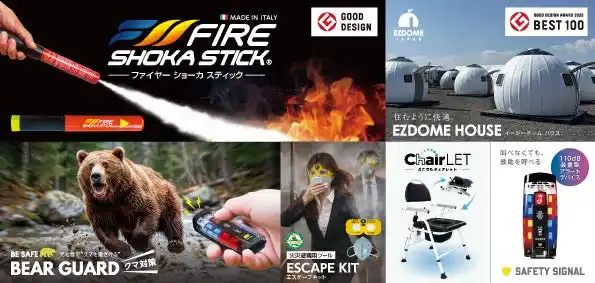 文夫)は、2026年4月15日(水)~4月17日(金)にインテックス大阪で開催される「防犯防災総合展2026」に出展することをお知らせいたします。展示ブースでは、日本国内で累計販売本数6万本を突破した片手で使える次世代消火器具「ファイヤーショーカスティック」をはじめ、光と音でクマを警戒させて遭遇リスクを下げる次世代安全デバイス「ベアーガード」、折りたためるポータブルシャワートイレ「どこでもチェアレット」、火災時における消火活動や安全な避難をサポートする「エスケープキット」、防災・犯罪・夜道対策用多目的セーフティデバイス「セーフティシグナル」、ニーズに合わせて活用できる多目的ハウス「イージードームハウス」の6点の災害対策グッズを展示いたします。 |