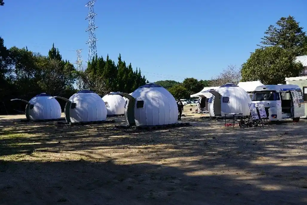 災害時の避難所における生活環境の問題とストレスを解決できることをはじめ、災害時の仮設避難所や対策本部、最前線基地としても活用できる多目的ドームハウスです。また平時には、解体して保管できることに加え、公園の休憩スペース、グランピング施設としての活用も可能です。 |