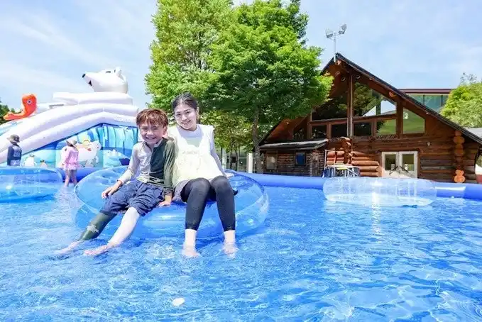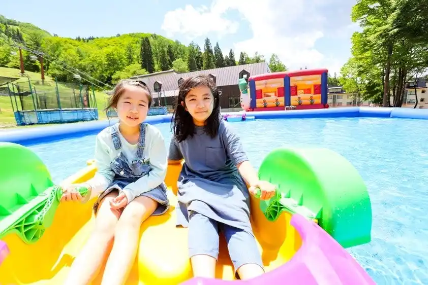 「キッズパーク」は豊かな自然に囲まれ、ふわふわ遊具やスライダー、じゃぶじゃぶ池など、小さなお子様から安心して楽しめる屋外エリア。親子セット券など家族向けプランもご用意しており、営業期間はご家族連れで賑わいます。 |
