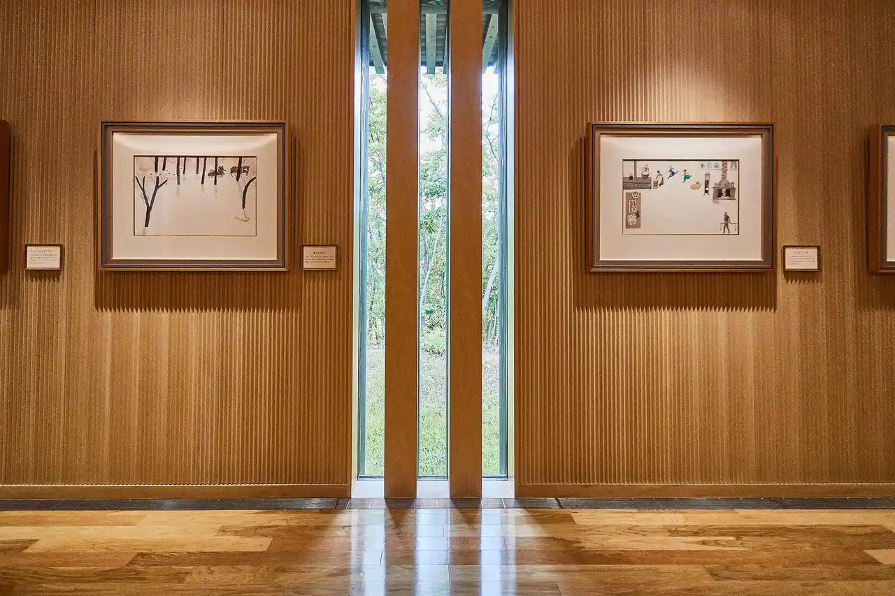 森の中に佇む安野光雅館は、画家・絵本作家である安野光雅氏の作品を展示する美術館です。森に抱かれるようにひっそりと佇む建築は、安藤忠雄氏の設計によるものです。美術館へと続く長い回廊や、周囲の景観に溶け込む杉板張りの外壁、わずかな開口部から差し込む光とともに、自然を感じながら作品をご鑑賞いただけます。 |
