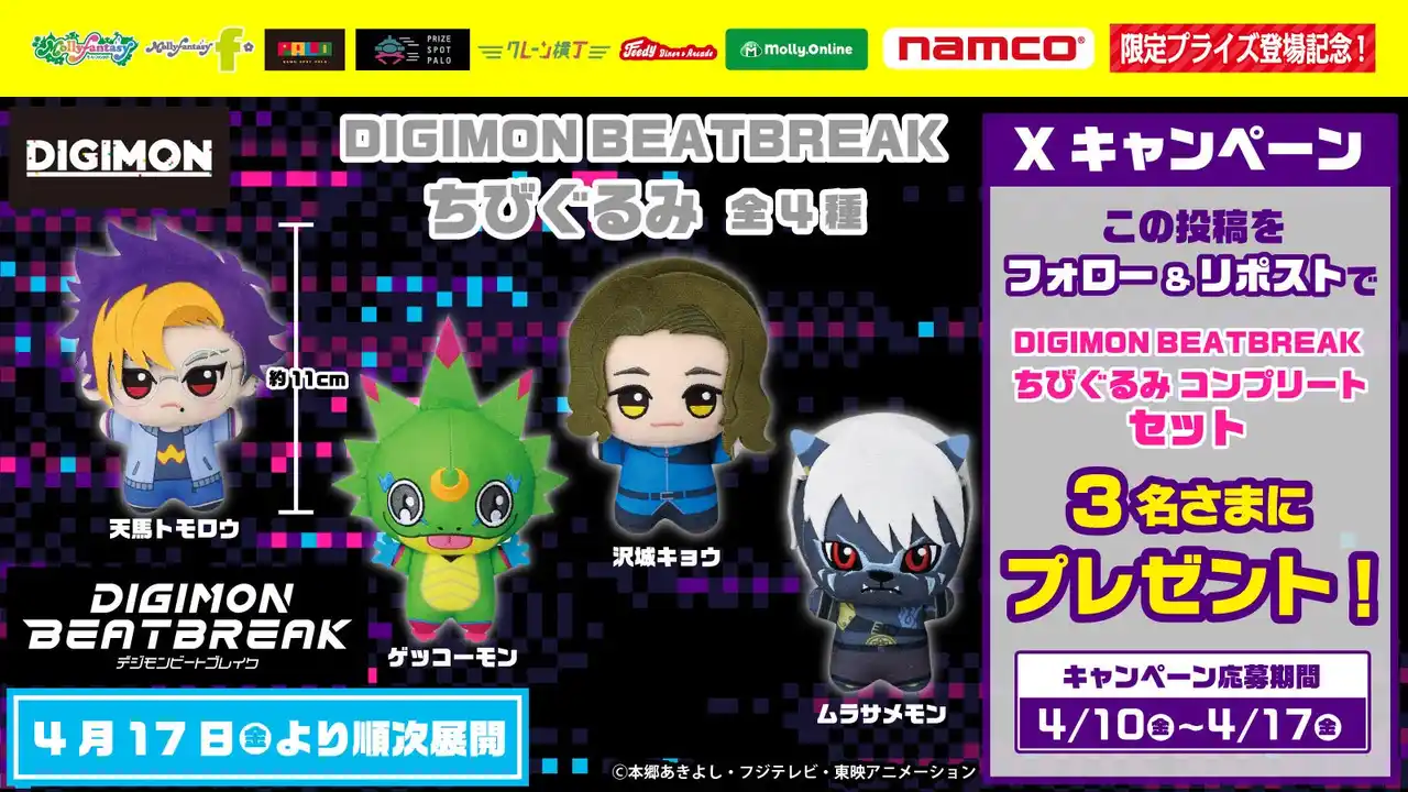 限定プライズ用景品の展開を記念し、モーリーファンタジー公式Xでは、「DIGIMON BEATBREAK ちびぐるみ プライズコンプリートセット」が抽選で3名さまに当たるSNSキャンペーンを開催いたします。詳細は公式アカウントをご確認ください。 |